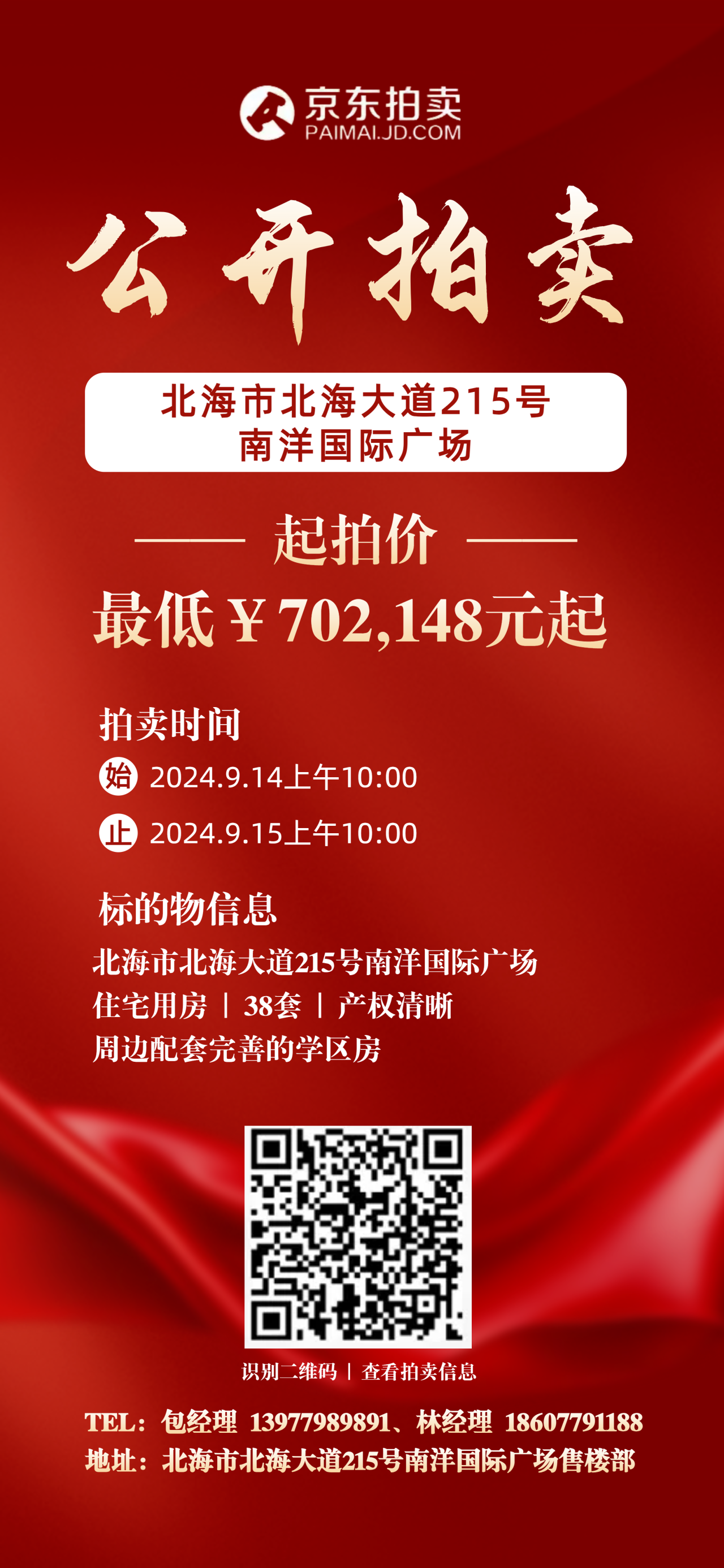 资产概况 m88下设的广西添富盈恺投资合伙企业拥有一批北海市南洋国际广场的不动产所有权、盛南地产部分商铺及地下车位的租赁权。南洋国际广场位于北海大道与贵州路交汇处,处于北海市海城区核心繁华地段,人流量大,配套完善,该项目的目标是打造北海首个酒店式行政公寓与城市示范智能家居小区。 该项目背靠国企的一手房源,产权清晰无纠纷,配套商场同步招商洽谈中,如果您有意向,请联系我们! 资产拍卖信息 资产亮点 01 位区优越 该项目以南洋国际广场为轴心,北接北海国际客运港及北海海滨公园(5分钟车程),西邻北海冠头岭国家森林公园(15分钟车程),向南驾驶15分钟即可抵达4A级旅游度假区——北海银滩,距离北海市高铁站、客运港仅需10分钟车程,前往福成机场、高速公路的路线畅通,附近公交线路可覆盖全市。 02 商业成熟 该项目周边拥有启东商城、和安商都、南森商厦、宁春城商业广场、亚世达商贸城、新力百货商业广场/新力广厦、时尚桂成购物中心等大型繁华商业综合体。同时靠近桂林银行、中国银行、建设银行、交通银行、农业银行等金融机构。 03 教育医疗 该项目所在区域有北海市海城区第十五小学、北海市海城区第十一小学、北海市海城区逸夫小学、北海市第五中学、北海市第三中学、北海市海城区西区学校等教育资源,同时拥有北海市人民医院、北海市皮肤病防治院、北海市第三人民医院、北海市中医医院等医疗配套。